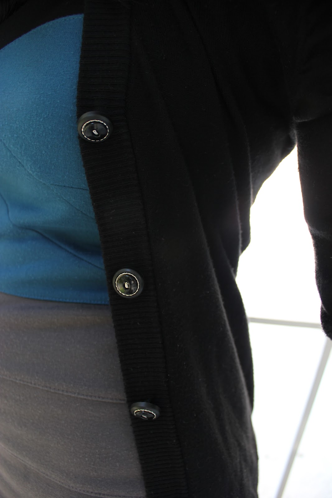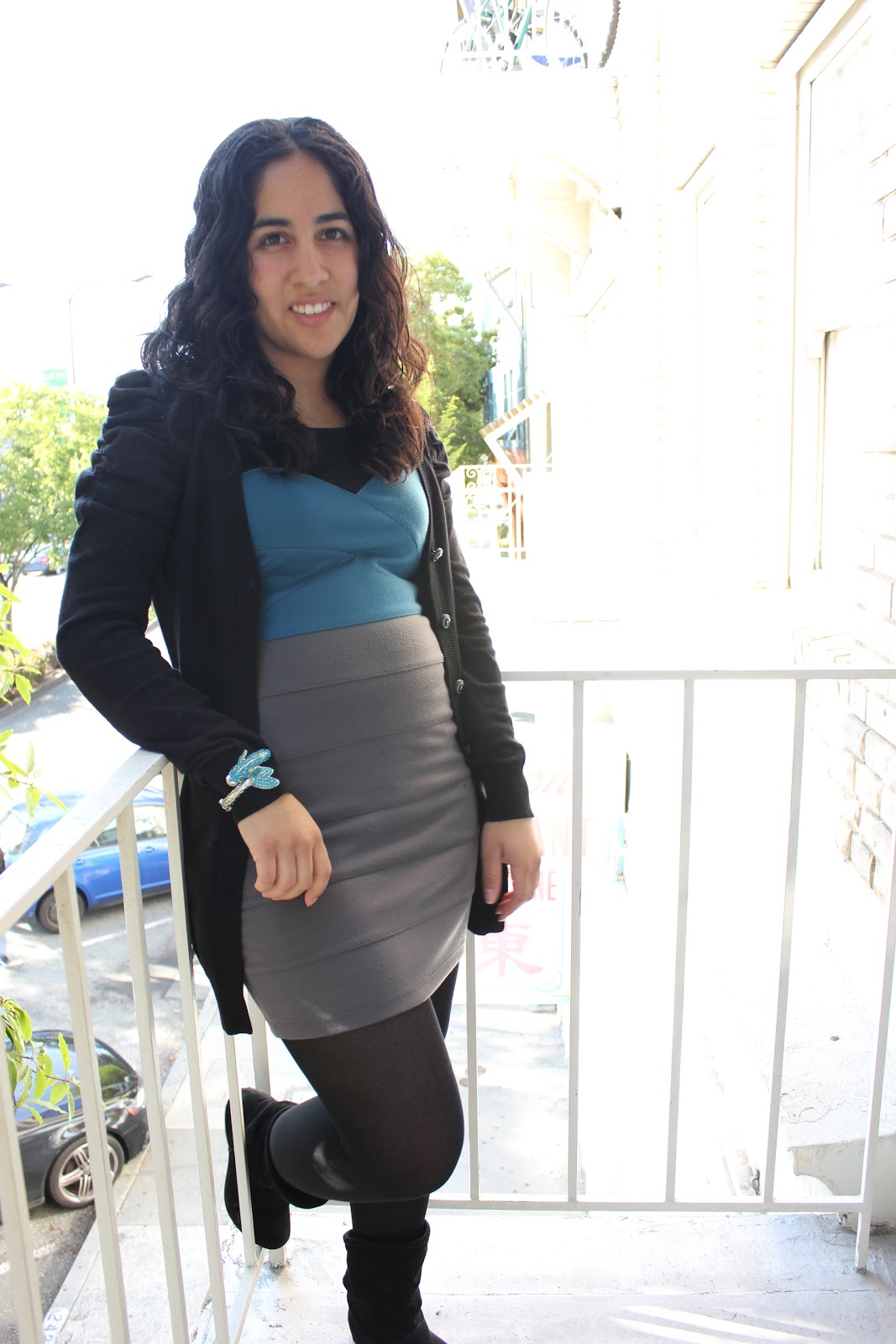 The chilly weather influenced today’s outfit. I decided to wear an everyday dress that I could layer a classic pair of black tights underneath. Afterwards everything else fell into place. I am wearing blacks and grey again, but at least there is a small pop of color with the teal on the dress and bracelet.