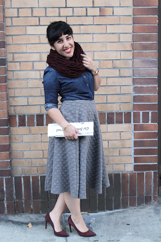 | Denim Button Down Banana Republic Factory Store | Grey Jacquard Dot Skirt JOA via LE TOTE (here) | Estelle Cluster Charm Bracelet Noir Luxe via LE TOTE (similar here) | Rose Gold Watch Marc by Marc Jacobs | Burgundy Knit Scarf Handmade (similar here) | Newspaper Clutch Kate Spade | Raisin Suede Issax Lug Pumps Enzo Angiolini c/o DSW (similar color heels here) | Le Rouge Intense Color Lipstick – 307 Grenate Initie Givenchy (here) |