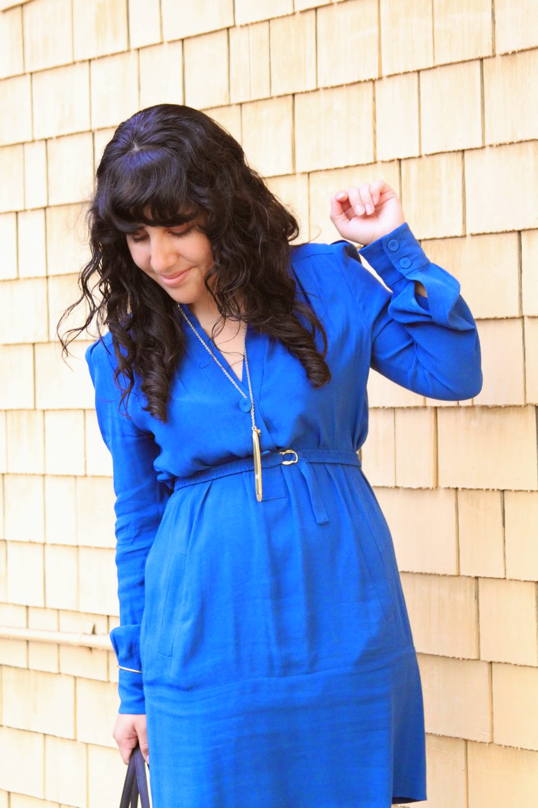 I love the school colors of my Alma Mater, so when I found this amazing dress at Crossroads Trading Co. in a lovely shade of blue I knew right away that I had to pair it with some gold jewelry. (The color of the dress pops even more against the yellow building.) Showing school spirit doesn’t always require wearing a pullover hoodie, especially at work. I received a lot of compliments from my coworkers for this look and I definitely think it had a lot to do with the color scheme.