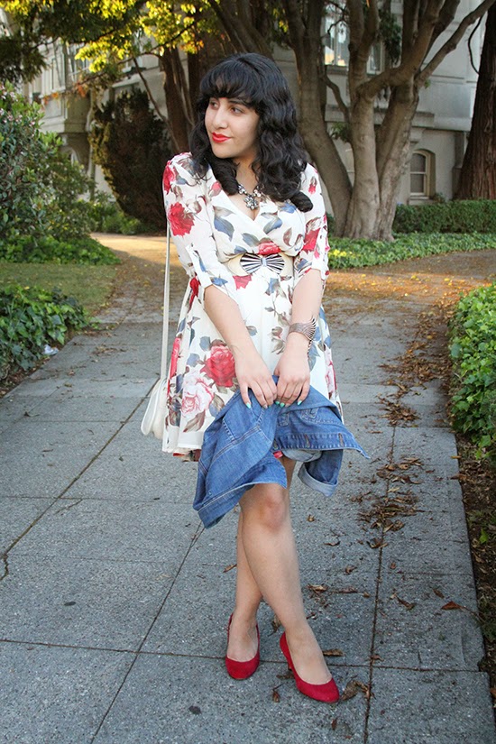 I love that this dress has a fun vintage floral print and I have spotted it before on a midi skirt from Modcloth. I loved the print, and have contemplated getting this in its midi skirt form, but I am really happy with this in this style! I can dress it down further with flats or sandals, add a hat, and drive off on a road trip or go to a flea market. I love clothes that make me envision doing something, and this one is no exception.