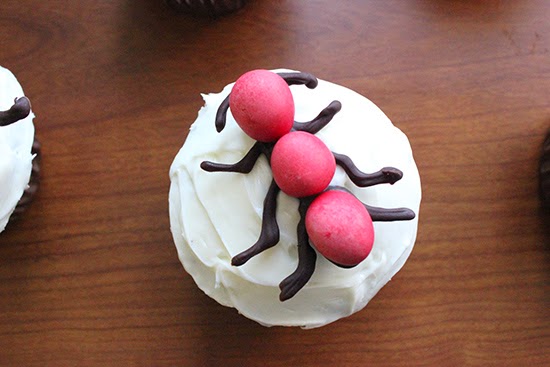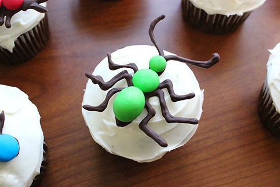 To make any shapes out of chocolate all you need is a ziplock bag, wax paper, and chocolate chips. I realized after awhile that it was progressively easier to transfer the insects from the wax paper onto the cupcake if the bugs stencil was drawn on thick. The rest of the ingredients include M&M’s (peanut and regular) and chocolate covered sunflower seeds (mine were from Trader Joe’s). The yellow Spider was actually meant to have a Mega M&M body, but I had no idea those existed or where I could find them. Now that made them, I notice them in a lot of grocery stores now, but using plain M&M’s worked out for me. Once the bugs were drawn, just add M&M’s and place in the fridge to harden. Use a spatula or butter knife to help remove the bugs from the wax paper and place on frosted cupcakes.