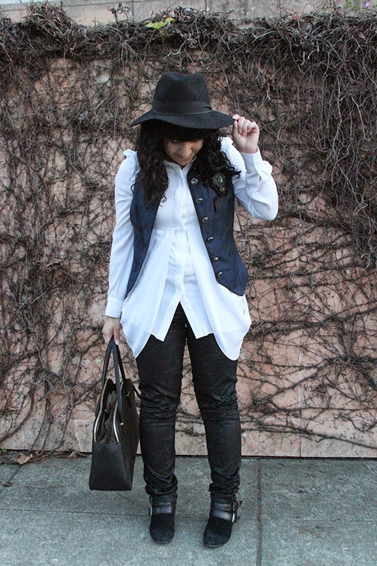 | Navy Military Inspired Vest Twelve by Twelve (here) | White Long Sleeve Button Down Alice + Olivia (similar here) | Black Brocade Print Pants Alice + Olivia | Black Pippen Booties Sam Edelman (similar here) | Black Cedar Street Small Elissa Bag Kate Spade (here) | |
